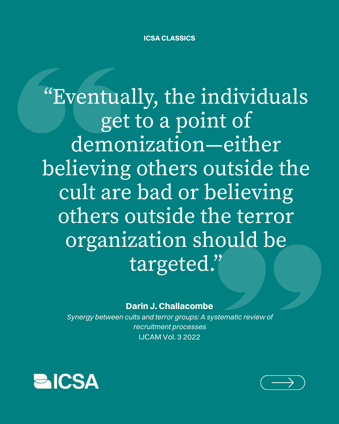 “Because contemporary researchers have focused more on terror groups than on cults, the archival knowledge from cult survivors and years of cult research has not been adequately illuminated as a guide for terror studies.”